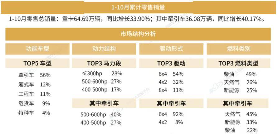 数据显现,在2025年1-10月牵引车总销量为36.08万辆,其间天然气动力占45%,新能源动力占33%,柴油动力仅占22%,也是出乎咱们的预料的。